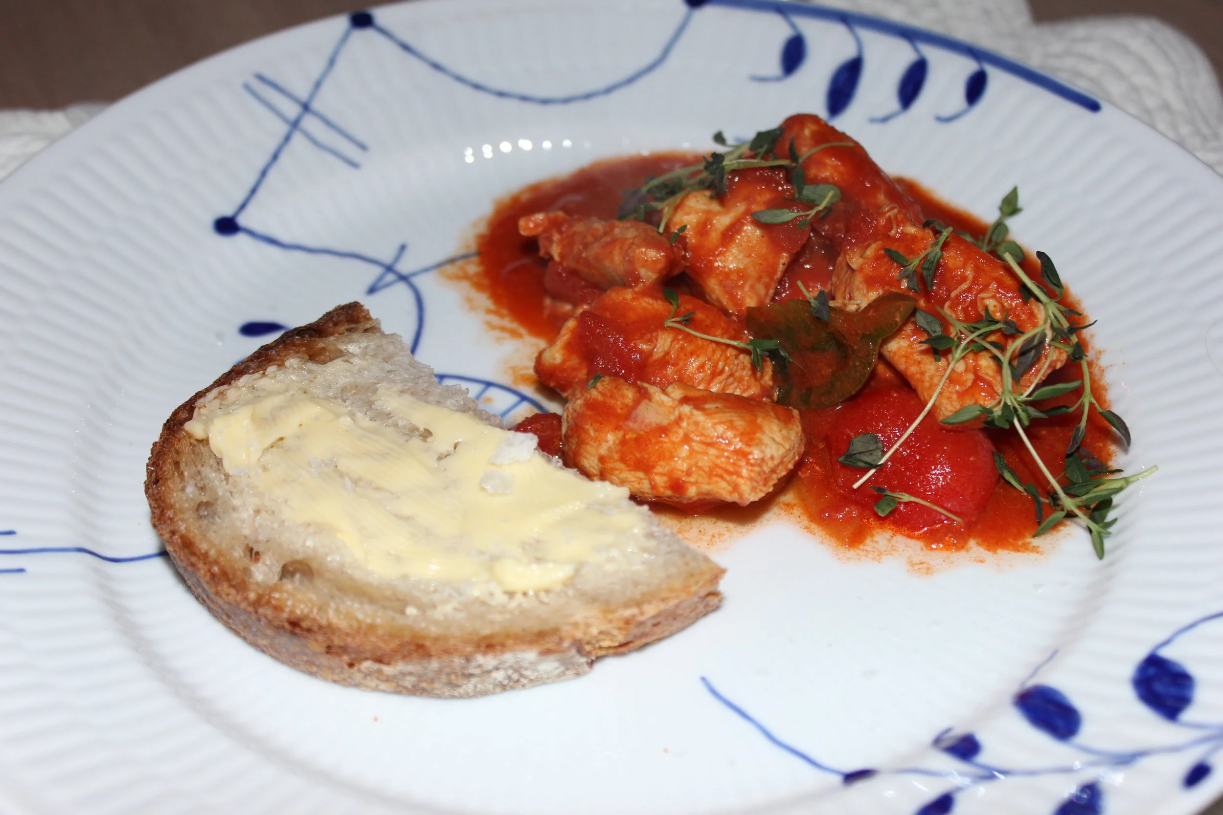 Varm litt olivenolje i en tykkbunnet kjele og tilsett finsnittet løk. Stek forsiktig til løken blir myk og blank og tilsett så 3 ss paprikapulver. Ikke ha for høy varme! Tilsett paprikaen i strimler og så tomatboksene. La det koke i 5 minutter og ha så i kyllingen skåret i ganske store biter. Jeg delte hvert bryst i ca 5 biter. Kok i ca 15 minutter til kyllingen er gjennomstekt og smak til med litt buljong dersom det er nødvendig.