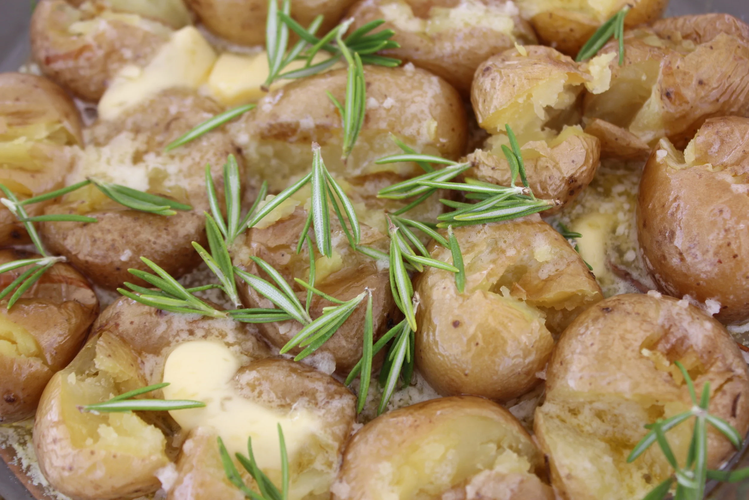 Skyll potetene i kaldt vann, tørk dem og legg dem i en ildfast form. Ringle over olje, salt og rosmarinblader. Stek potetene midt i ovnen på 225 grader i 30 - 45 minutter, kommer an på størrelsen på potetene. Rist på formen underveis. Mos de ferdigstekte potetene lett med en gaffel og legg en liten smørklatt i hver potet. Ha over litt mer rosmarin og server umiddelbart.